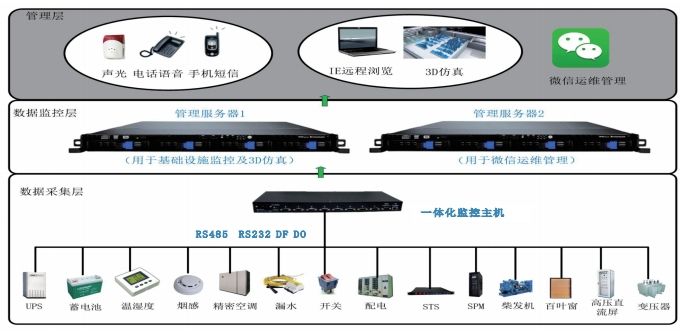 動力環(huán)境監(jiān)控系統(tǒng)主要針對各種通信用機房的設(shè)備特點和工作環(huán)境,對機房內(nèi)的電源、蓄電池組、UPS、發(fā)電機、空調(diào)等智能、非智能設(shè)備以及溫濕度、煙霧、漏水、門禁等環(huán)境量實現(xiàn)“遙測、遙信、遙控、遙調(diào)”等功能。 動力環(huán)境監(jiān)控系統(tǒng)充分利用了機房內(nèi)傳輸設(shè)備所能提供的各種傳輸信道資源,實現(xiàn)機房內(nèi)各項告警和數(shù)據(jù)快速有效的上傳,同時由監(jiān)控中心軟件進行圖形化人機界面展示,可對所有機房的全參數(shù)、全方位的監(jiān)控,智能化短信外呼報警,實時事件記錄,提高用戶的維護管理效率,實現(xiàn)機房可靠的科學(xué)管理。
